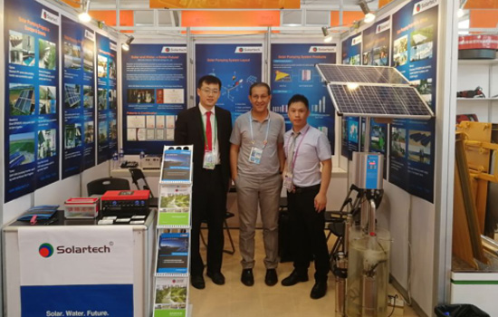 在本届广交会上,kaiyun入口新能着重向客户推荐了三项光伏扬水系统产品的先进系统技术,即系统优化选型技术,提供最佳供水效率方案、保障系统综合运行效益;远程监控智能水务技术,远程故障诊断、便捷售后服务、智能运维管理;混合动力互补供电技术,配置市电、风电、柴油机、储能电池智能接入管理系统。这三项系统技术得到了新老客户,特别是专业客户的高度认可和赞扬,许多客户表示将引进这三项技术并推广应用到当地市场。