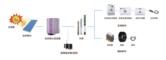 光伏扬水逆变器对系统运行实施控制和调节,控制光伏阵列将太阳辐射能转化成电能,实现最大功率点跟踪,调节输出频率与日照辐射同步转换,驱动水泵将地下水或河水从低位提至高位,水泵由三相异步电机/直流无刷电机/永磁同步电机驱动,从江河湖井中提水或向灌溉设备加压。远程监控器对系统进行数据采集、智能分析、异常告警,通过Solar Winsight手机监控APP软件或SP Master光伏扬水系统用户管理平台对系统运维进行管控。