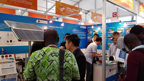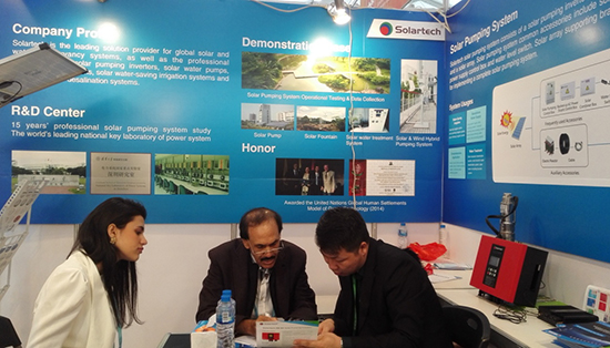 上图是沙特阿拉伯客户在仔细了解我司智能水务解决方案。依据客户需求,我司参展同事向客户着重推荐了配备远程监控系统的光伏扬水系统产品来解决客户农场智能化取水灌溉需求,不出办公室就可以通过我司后端管理平台实时掌控光伏扬水系统全部核心运行数据和动态。
