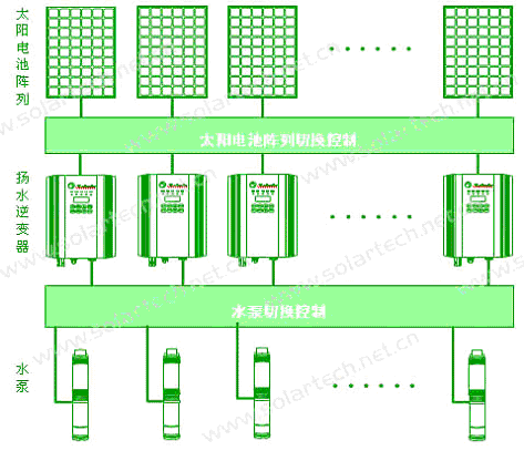 多机系统是指系统中有多台水泵,可以采用单台大功率逆变器驱动多台水泵,也可采用多台功率相匹配的逆变器。在流量要求大的场合,多机系统的运行具有更大的灵活性。通过太阳电池阵列及水泵切换控制,日照充足时,所有水泵以MPPT方式运行;日照较弱时,关停部分水泵,太阳电池阵列集中为部分继续运行的水泵供电。在单机系统优化的基础上,水泵的调速范围能够得到进一步优化,始终处于高效运行状态。