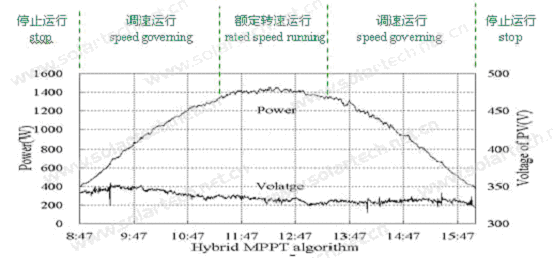 采用kaiyun入口新能源光伏扬水逆变器,根据日照强度的变化调节水泵转速,使输出功率接近太阳电池阵列的最大功率;当日照很充足时,保证水泵的转速不超过额定转速;当日照不足时,根据设定最低运行频率是否满足,否则自动停止运行。