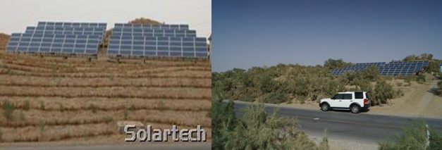 2001年,全球第一套“光伏提水沙漠高速公路防沙林灌溉系统”被应用于我国新疆哈德沙漠高速公路肖塘路段。该系统功率为15千瓦、扬程为45米、日扬水6-7.5小时,为沙漠高速公路防沙所种植的灌木、拐枣、柽柳等进行节水滴灌,形成公路防沙林。起到固沙绿化,阻止沙漠化蔓延,改善周围环境及生态环境的作用。该系统全年运行可发电27,375 千瓦·时,在25年使用年限内可节省标准煤257.3吨、减排二氧化碳113.2吨、二氧化硫5.1吨、烟尘3.9吨、灰渣 66.9吨。