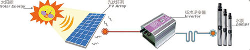 光伏提水系统亦称太阳能水泵系统,该系统由太阳能电池阵列、光伏扬水逆变器、水泵组成。太阳能电池阵列由多块太阳电池组件串并联而成,吸收日照辐射能量并将其转化为电能,为整个系统提供动力电源。光伏扬水逆变器对系统的运行实施控制和调节,将太阳电池阵列发出的直流电转换为交流电,驱动水泵,并根据日照强度的变化实时地调节输出频率,实现最大功率点跟踪,最大限度地利用太阳能。水泵由三相交流电机驱动,从深井中抽水,注入蓄水箱/池或直接接入灌溉系统。根据实际系统需求和安装条件,可采用不同类型的水泵进行工作。